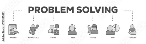 Problem solving icons process structure web banner illustration of analysis, critical thinking, creativity, emotional intelligence, research, team building icon live stroke and easy to edit