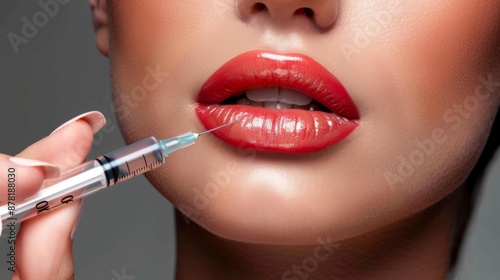 Procedure lip augmentation, Cosmetologist does injection Lip filling close-up pic about a woman lips