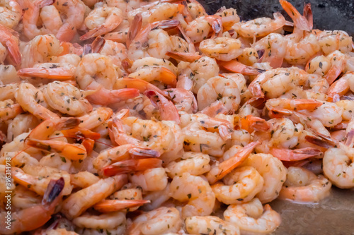 Process of cooking fresh red king prawns on grill at summer local food market - close up view. Outdoor cooking, gastronomy, seafood, barbecue, street food concept
