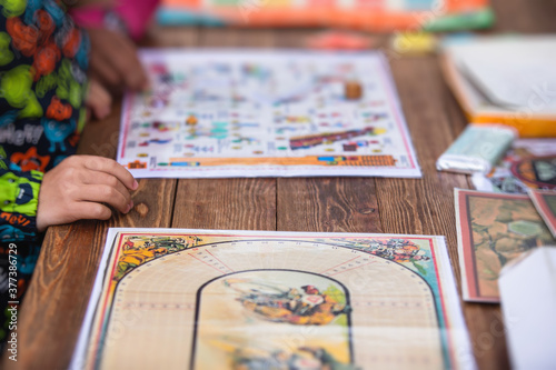 Process of playing retro vintage old style board game and having fun with friends and family, board game concept, hand playing and roll the dice