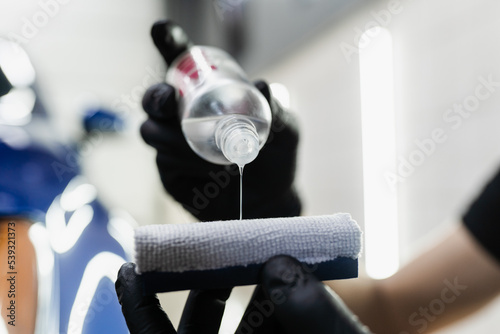 Process of pouring ceramic liquid from bottle on sponge to apply a protective nano layer on car. Detailing service worker applies ceramic protective liquid on sponge close-up.