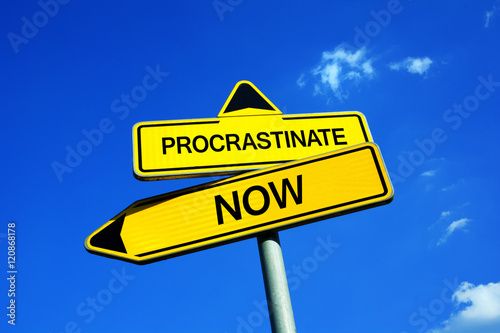 Procrastinate or Now - Traffic sign with two options - procrastination and postponing tasks vs time management, self-management. Laziness vs responsibility and enthusiasm into accomplishing obligation