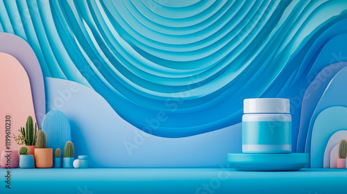 Product Display on Abstract Blue Background: Stylish Cosmetic Jar Mockup with Cactus Plants