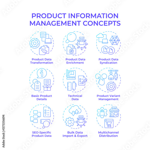 Product information management blue gradient concept icons. Commercial data analyzing. Goods distribution strategy. Icon pack. Vector images. Round shape illustrations for booklet. Abstract idea