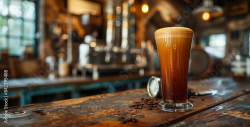 Product photo of nitro cold brew coffee, on wooden table top surface, isolated on white background. studio lighting.