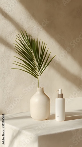 Product photography, beige background with a palm leaf shadow on the wall, two bottles of shampoo in front of it, one vase and a small succulent plant next to them, simple geometric shapes, minimalist