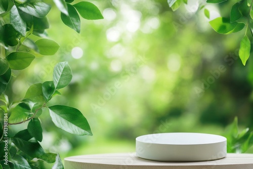 product podium in nature outdoors forest blurred green background. natural product placement, with generative ai