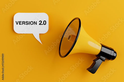 Product Update Concept. Yellow Megaphone With Speech Bubble Showing Version Two. 3d Rendering