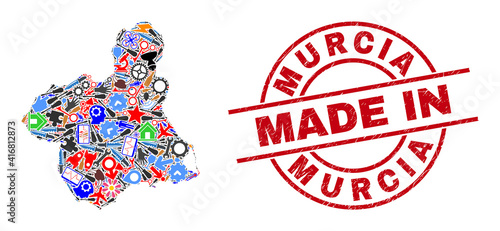 Production Murcia Province map mosaic and MADE IN grunge stamp. Murcia Province map mosaic designed with spanners, wheels, tools, items, transports, power bolts, details.