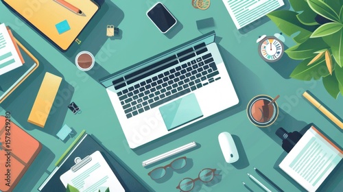 Productivity illustration: Desktop view of a modern workspace with laptop and accessories