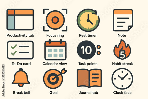 Productivity tools icons: timer, calendar, to-do, notes, goals, clock