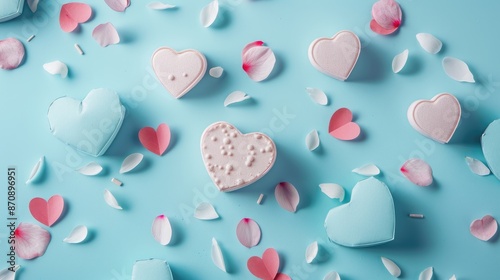 Products and heart shaped papers on light blue background as aphrodisiac alternatives