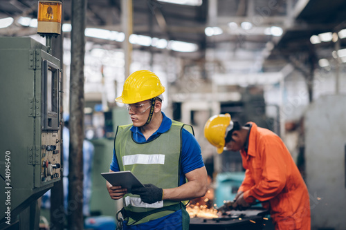 profession technician engineer operate heavy machine to automated CNC in factory, worker with check list