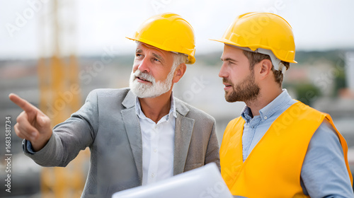 Professional 2 Site Managers Reviewing Real Estate Development on Construction Site