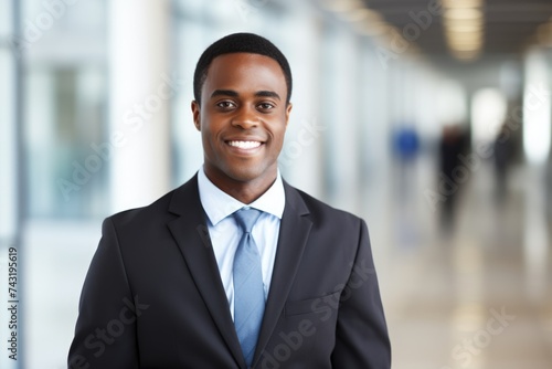 Professional African American Businessman Portrait. Confident African American businessman smiling in a modern corporate environment.