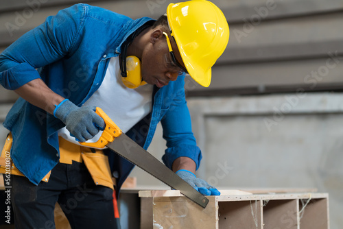 Professional African American male carpenter cutting lumber wood with handsaw in the wood workshop. Male carpenter working at the furniture workshop