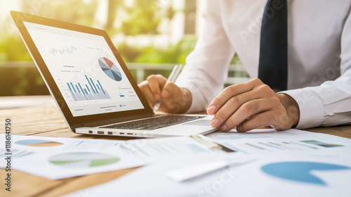 Professional Analyzing Data with Laptop and Graphs on Desk