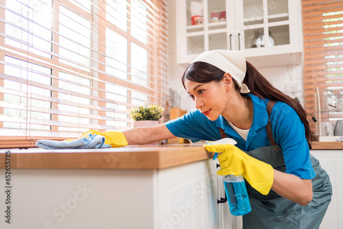 Professional Asian woman cleaning service wearing yellow rubber gloves, using a rag to wipe with spraying liquid detergent on the wooden top kitchen counter at home. Housekeeping cleanup, cleaner.