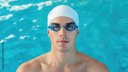Professional athlete swimmer recovering from a rotator cuff injury or sports shoulder injury wearing a supportive wrap and training in a deep blurred field or pool environment