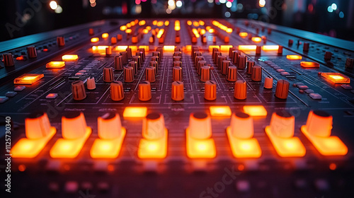professional audio mixing console illuminated by vibrant LED lights, showcasing precision dials, sliders, and colorful buttons. Represents sound engineering, creativity, and innovation