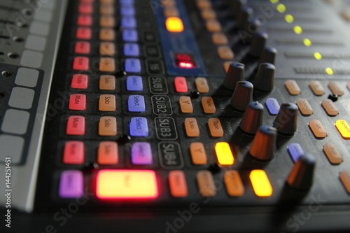 Professional audio operator working on audio mixer knobs during live TV telecast
