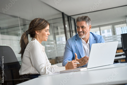 Professional bank manager consulting company client on financial taxes. Two middle aged professional executives team business people working together on laptop computer at office corporate meeting.