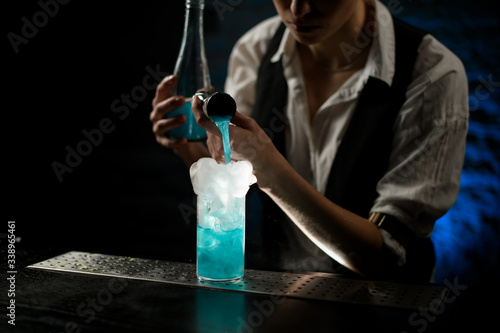professional bartender masterly pours blue drink into smoky glass on bar counter.