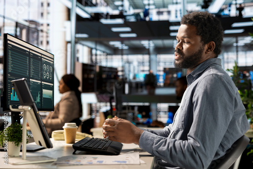 Professional black investor leads a teleconference with his staff, discussing project details and strategic objectives. Virtual chat meeting ensures efficient communication across locations.