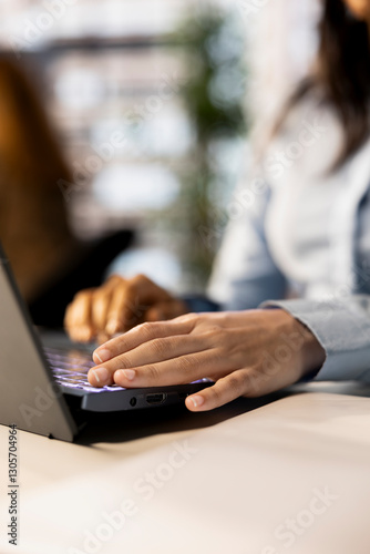 Professional business developer engages in project management at her desk, working on multinational company growth. Worker focusing on strategy planning to drive corporate success. Close up.