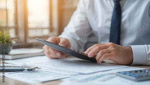 Professional businessman calculating finances with calculator at modern office desk, focused work