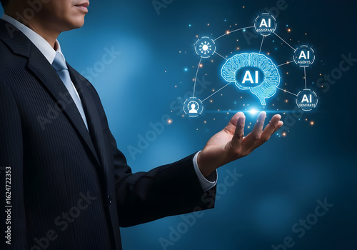 Professional Businessman Holding Digital AI Brain with Connectivity Icons for Technology and Innovation Concepts