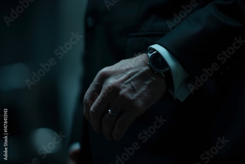Professional businessman in a tailored suit adjusting his cufflinks in a modern office setting, preparing for an important corporate meeting