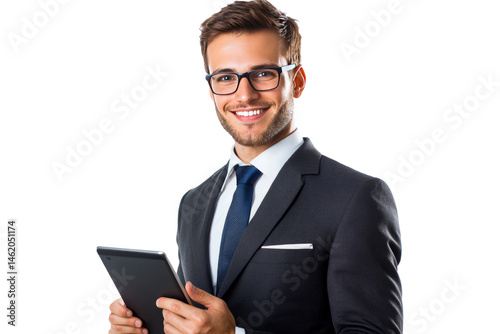 Professional businessman wearing glasses holding a tablet, smiling nicely, business concept
