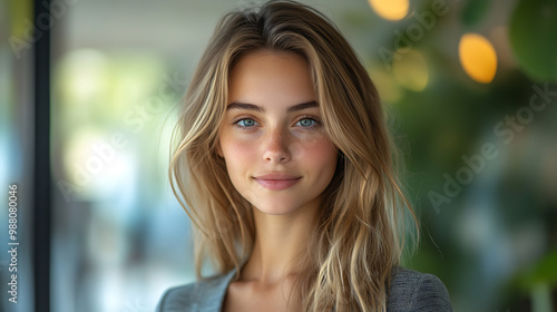 Professional Businesswoman in Modern Office Setting with Even Lighting and Neutral Color Palette