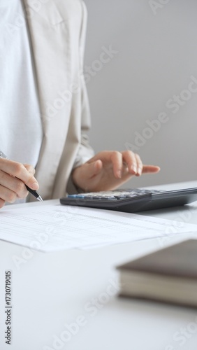 Professional businesswoman is calculating annual tax using calculator and taking notes in the office background, managing budget and checking financial documents. Audit and taxes in business