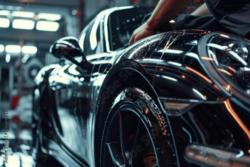 Professional Car Wash Worker Hand Drying a Shiny Black Sports Car with Microfiber Cloth