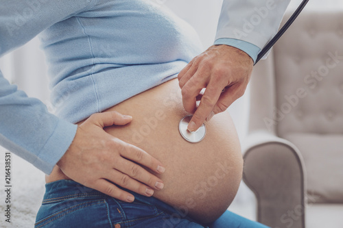 Professional care. Profile photo of young female that putting hands on the belt and sitting in the consulting room