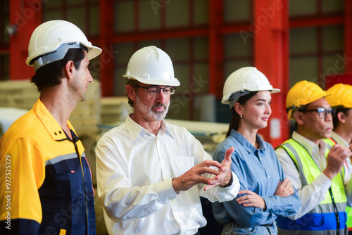 Professional Caucasian manager engineer wearing white helmet is training industry factory worker, workshop operator, mechanical engineering team production in heavy industrial manufacture factory.