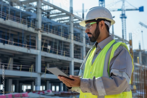Professional construction engineer in safety gear attentively reviews plans on a digital tablet at a bustling building site with cranes and scaffolding in the background