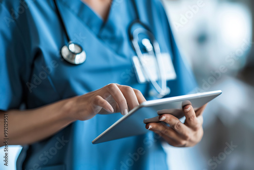 Professional doctor using a digital tablet in a modern hospital, focus on technology in medicine