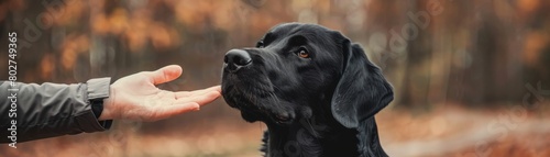 Professional dog trainer teaching commands to a focused black dog, illustrating effective training methods and animal obedience