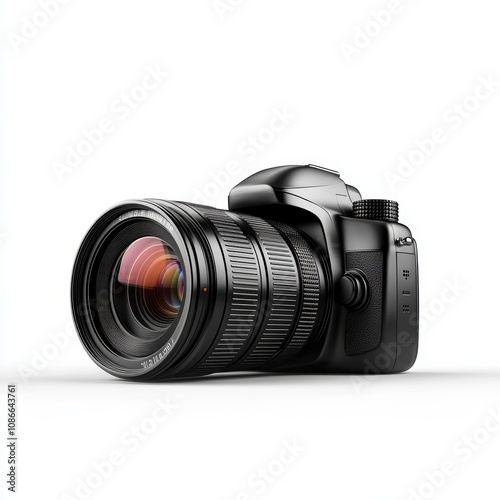 Professional DSLR camera with zoom lens on a white isolated background.