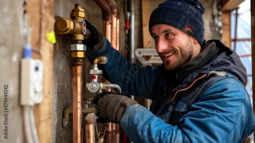 Professional engineer installing a natural gas boiler at home, he is checking the pipes.