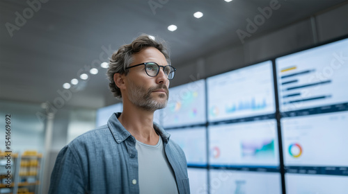 Professional entrepreneur reviewing business analytics on large display screen