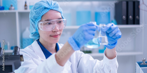 Professional expertise woman research scientist compare blue liquid in test tube or glassware beaker in chemical scientific experiment laboratory, female doctor pharmacy biology medicine person