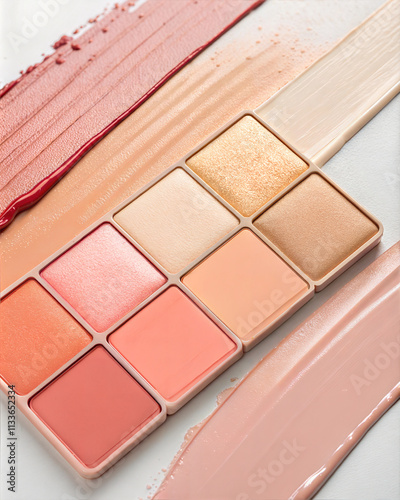 Professional eye shadow pink pastel palette and cosmetic smears on white background. Palette of decorative cosmetics, blush, eye shadows, lip glosses. Ai generated