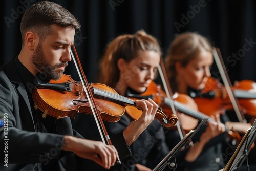 Professional female and male string musicians playing violin and cello with chamber quartet against black curtains, Generative AI