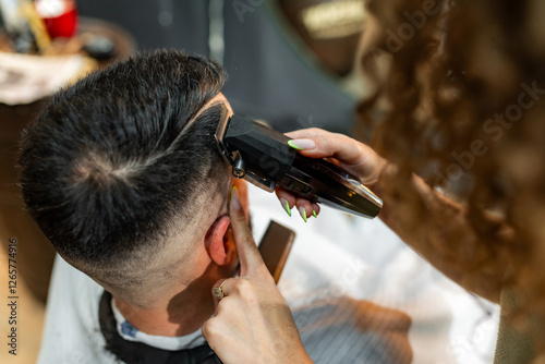 Professional female barber carefully cutting man's hair with electric clipper, creating stylish fade and precise lines in modern barbershop environment