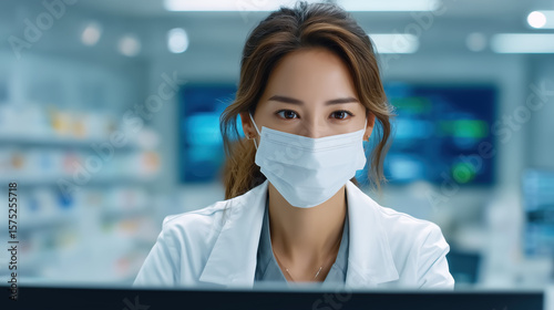 Professional female doctor in a lab coat wearing a mask while working on a computer in a modern medical facility with charts in the background