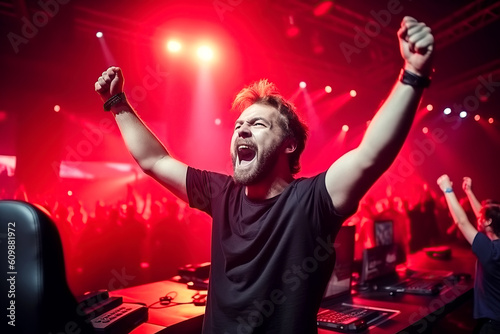 professional gamer player is happy to win cyber sports games championship in arena. Generative AI